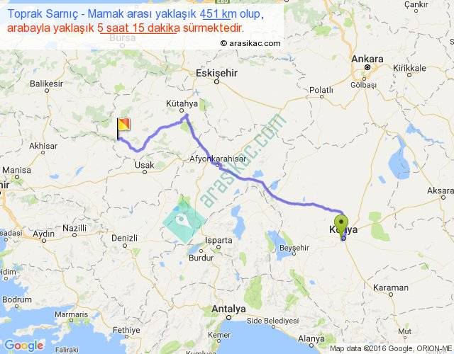 Toprak Sarnıç - Mamak arası yaklaşık olarak 90 km/h ile yukarıda belirtilen sürede olup, iki yerin kuş uçuşu uzaklığı (mesafesi) 328'dir. Eğer belirtilen yerler arasında uçak seferi var ise bu süre uçakla 30 dakika'ya kadar düşebilir. Yolculuk otobüsle 6 saat 49 dakika sürmektedir.
