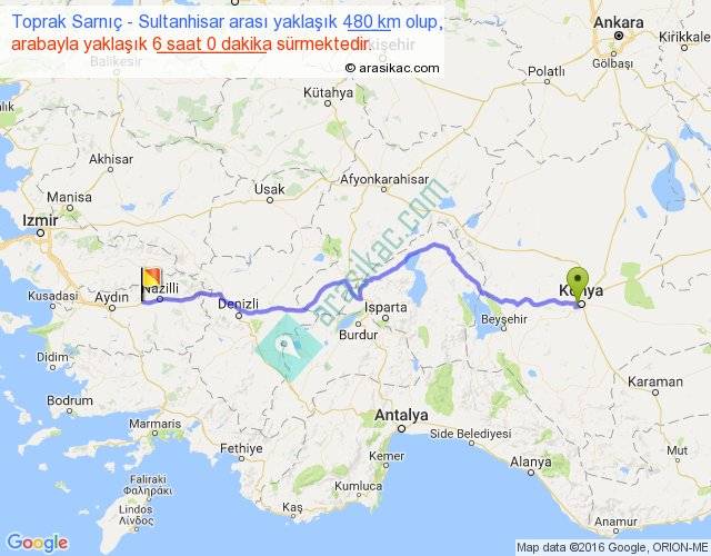 Toprak Sarnıç - Sultanhisar arası yaklaşık olarak 90 km/h ile yukarıda belirtilen sürede olup, iki yerin kuş uçuşu uzaklığı (mesafesi) 375'dir. Eğer belirtilen yerler arasında uçak seferi var ise bu süre uçakla 34 dakika'ya kadar düşebilir. Yolculuk otobüsle 7 saat 48 dakika sürmektedir.