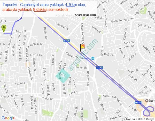 Topselvi - Cumhuriyet arası yaklaşık olarak 90 km/h ile yukarıda belirtilen sürede olup, iki yerin kuş uçuşu uzaklığı (mesafesi) 1'dir. Yolculuk otobüsle 10 dakika sürmektedir.