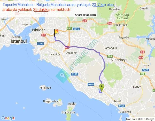 Topselvi Mahallesi - Bulgurlu Mahallesi arası yaklaşık olarak 90 km/h ile yukarıda belirtilen sürede olup, iki yerin kuş uçuşu uzaklığı (mesafesi) 17'dir. Yolculuk otobüsle 32 dakika sürmektedir.