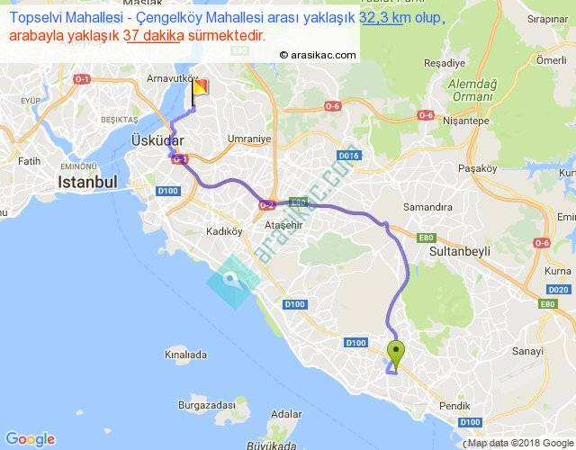 Topselvi Mahallesi - Çengelköy Mahallesi arası yaklaşık olarak 90 km/h ile yukarıda belirtilen sürede olup, iki yerin kuş uçuşu uzaklığı (mesafesi) 21'dir. Yolculuk otobüsle 48 dakika sürmektedir.