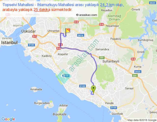 Topselvi Mahallesi - Ihlamurkuyu Mahallesi arası yaklaşık olarak 90 km/h ile yukarıda belirtilen sürede olup, iki yerin kuş uçuşu uzaklığı (mesafesi) 15'dir. Yolculuk otobüsle 32 dakika sürmektedir.