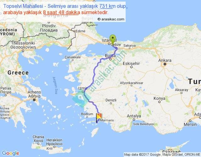 Topselvi Mahallesi - Selimiye arası yaklaşık olarak 90 km/h ile yukarıda belirtilen sürede olup, iki yerin kuş uçuşu uzaklığı (mesafesi) 473'dir. Eğer belirtilen yerler arasında uçak seferi var ise bu süre uçakla 43 dakika'ya kadar düşebilir. Yolculuk otobüsle 11 saat 26 dakika sürmektedir.