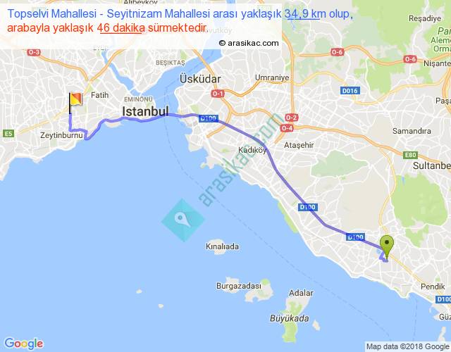 Topselvi Mahallesi - Seyitnizam Mahallesi arası yaklaşık olarak 90 km/h ile yukarıda belirtilen sürede olup, iki yerin kuş uçuşu uzaklığı (mesafesi) 28'dir. Yolculuk otobüsle 59 dakika sürmektedir.