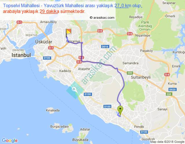 Topselvi Mahallesi - Yavuztürk Mahallesi arası yaklaşık olarak 90 km/h ile yukarıda belirtilen sürede olup, iki yerin kuş uçuşu uzaklığı (mesafesi) 19'dir. Yolculuk otobüsle 37 dakika sürmektedir.