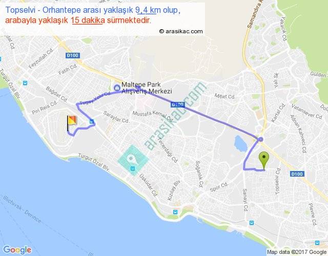 Topselvi - Orhantepe arası yaklaşık olarak 90 km/h ile yukarıda belirtilen sürede olup, iki yerin kuş uçuşu uzaklığı (mesafesi) 6'dir. Yolculuk otobüsle 19 dakika sürmektedir.