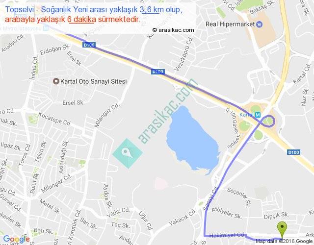 Topselvi - Soğanlık Yeni arası yaklaşık olarak 90 km/h ile yukarıda belirtilen sürede olup, iki yerin kuş uçuşu uzaklığı (mesafesi) 2'dir. Yolculuk otobüsle 7 dakika sürmektedir.