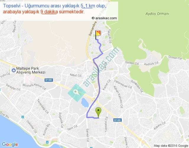 Topselvi - Uğurmumcu arası yaklaşık olarak 90 km/h ile yukarıda belirtilen sürede olup, iki yerin kuş uçuşu uzaklığı (mesafesi) 4'dir. Yolculuk otobüsle 11 dakika sürmektedir.