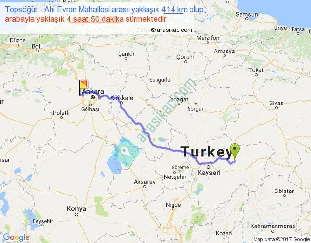 Topsöğüt - Ahi Evran Mahallesi arası yaklaşık olarak 90 km/h ile yukarıda belirtilen sürede olup, iki yerin kuş uçuşu uzaklığı (mesafesi) 325'dir. Eğer belirtilen yerler arasında uçak seferi var ise bu süre uçakla 30 dakika'ya kadar düşebilir. Yolculuk otobüsle 6 saat 17 dakika sürmektedir.