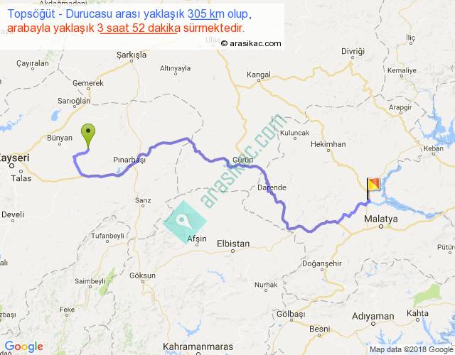 Topsöğüt - Durucasu arası yaklaşık olarak 90 km/h ile yukarıda belirtilen sürede olup, iki yerin kuş uçuşu uzaklığı (mesafesi) 190'dir. Yolculuk otobüsle 5 saat 1 dakika sürmektedir.