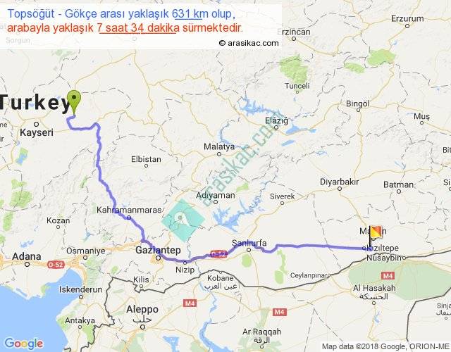 Topsöğüt - Gökçe arası yaklaşık olarak 90 km/h ile yukarıda belirtilen sürede olup, iki yerin kuş uçuşu uzaklığı (mesafesi) 441'dir. Eğer belirtilen yerler arasında uçak seferi var ise bu süre uçakla 40 dakika'ya kadar düşebilir. Yolculuk otobüsle 9 saat 50 dakika sürmektedir.