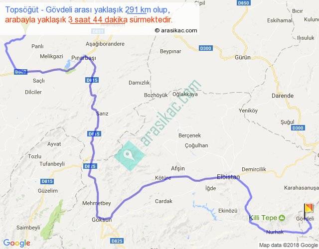 Topsöğüt - Gövdeli arası yaklaşık olarak 90 km/h ile yukarıda belirtilen sürede olup, iki yerin kuş uçuşu uzaklığı (mesafesi) 160'dir. Yolculuk otobüsle 4 saat 51 dakika sürmektedir.