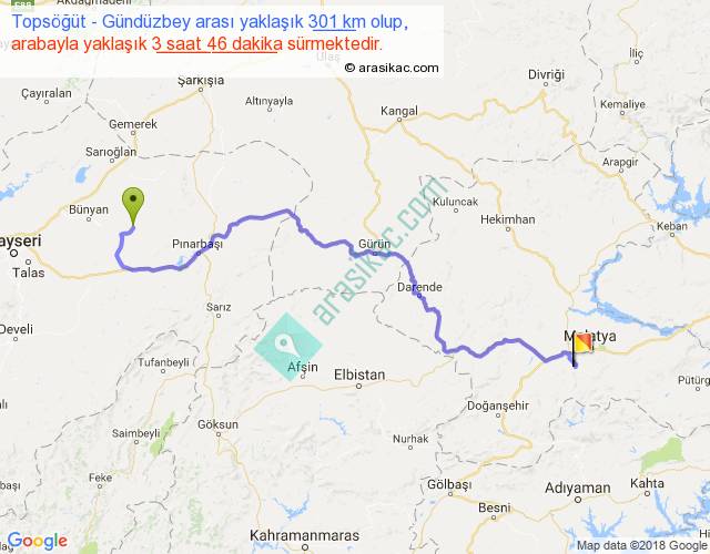 Topsöğüt - Gündüzbey arası yaklaşık olarak 90 km/h ile yukarıda belirtilen sürede olup, iki yerin kuş uçuşu uzaklığı (mesafesi) 198'dir. Yolculuk otobüsle 4 saat 53 dakika sürmektedir.