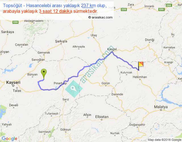 Topsöğüt - Hasancelebi arası yaklaşık olarak 90 km/h ile yukarıda belirtilen sürede olup, iki yerin kuş uçuşu uzaklığı (mesafesi) 158'dir. Yolculuk otobüsle 4 saat 9 dakika sürmektedir.