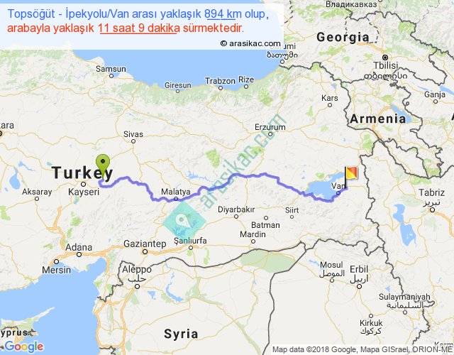 Topsöğüt - İpekyolu Van arası yaklaşık olarak 90 km/h ile yukarıda belirtilen sürede olup, iki yerin kuş uçuşu uzaklığı (mesafesi) 651'dir. Eğer belirtilen yerler arasında uçak seferi var ise bu süre uçakla 1 saat 00 dakika'ya kadar düşebilir. Yolculuk otobüsle 14 saat 29 dakika sürmektedir.