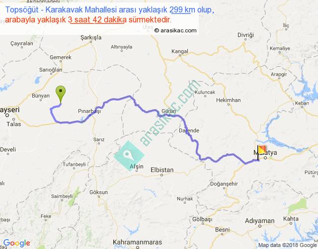 Topsöğüt - Karakavak Mahallesi arası yaklaşık olarak 90 km/h ile yukarıda belirtilen sürede olup, iki yerin kuş uçuşu uzaklığı (mesafesi) 196'dir. Yolculuk otobüsle 4 saat 48 dakika sürmektedir.