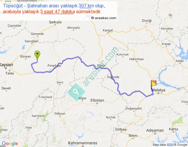 Topsöğüt - Şahnahan arası yaklaşık olarak 90 km/h ile yukarıda belirtilen sürede olup, iki yerin kuş uçuşu uzaklığı (mesafesi) 190'dir. Yolculuk otobüsle 4 saat 55 dakika sürmektedir.