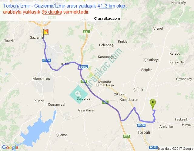 Torbalı İzmir - Gaziemir İzmir arası yaklaşık olarak 90 km/h ile yukarıda belirtilen sürede olup, iki yerin kuş uçuşu uzaklığı (mesafesi) 26'dir. Yolculuk otobüsle 45 dakika sürmektedir.