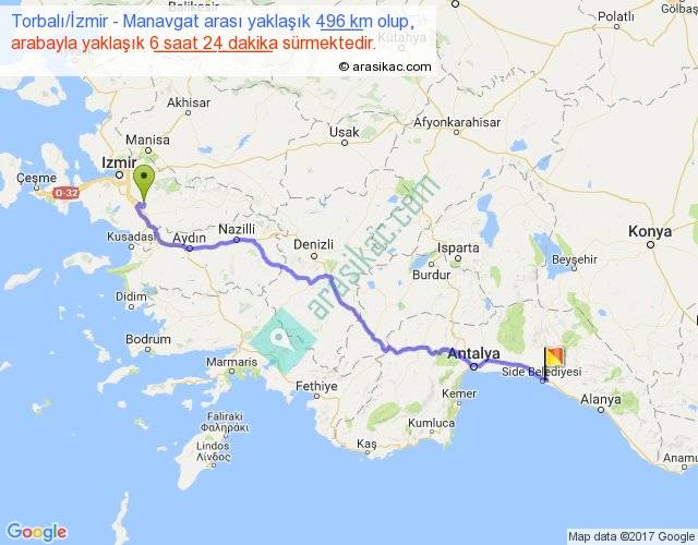 Torbalı İzmir - Manavgat arası yaklaşık olarak 90 km/h ile yukarıda belirtilen sürede olup, iki yerin kuş uçuşu uzaklığı (mesafesi) 388'dir. Eğer belirtilen yerler arasında uçak seferi var ise bu süre uçakla 35 dakika'ya kadar düşebilir. Yolculuk otobüsle 8 saat 19 dakika sürmektedir.