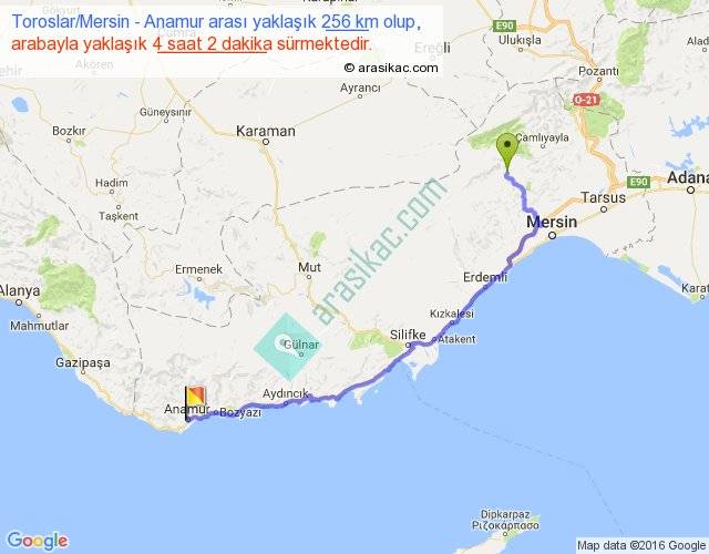Toroslar Mersin - Anamur arası yaklaşık olarak 90 km/h ile yukarıda belirtilen sürede olup, iki yerin kuş uçuşu uzaklığı (mesafesi) 178'dir. Yolculuk otobüsle 5 saat 14 dakika sürmektedir.