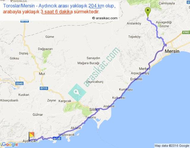Toroslar Mersin - Aydıncık arası yaklaşık olarak 90 km/h ile yukarıda belirtilen sürede olup, iki yerin kuş uçuşu uzaklığı (mesafesi) 140'dir. Yolculuk otobüsle 4 saat 1 dakika sürmektedir.