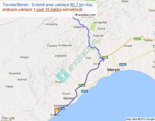Toroslar Mersin - Erdemli arası yaklaşık olarak 90 km/h ile yukarıda belirtilen sürede olup, iki yerin kuş uçuşu uzaklığı (mesafesi) 51'dir. Yolculuk otobüsle 1 saat 41 dakika sürmektedir.
