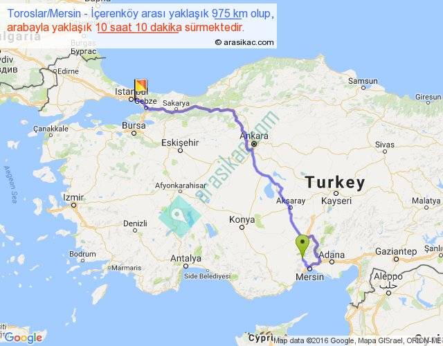 Toroslar Mersin - İçerenköy arası yaklaşık olarak 90 km/h ile yukarıda belirtilen sürede olup, iki yerin kuş uçuşu uzaklığı (mesafesi) 628'dir. Eğer belirtilen yerler arasında uçak seferi var ise bu süre uçakla 57 dakika'ya kadar düşebilir. Yolculuk otobüsle 13 saat 13 dakika sürmektedir.