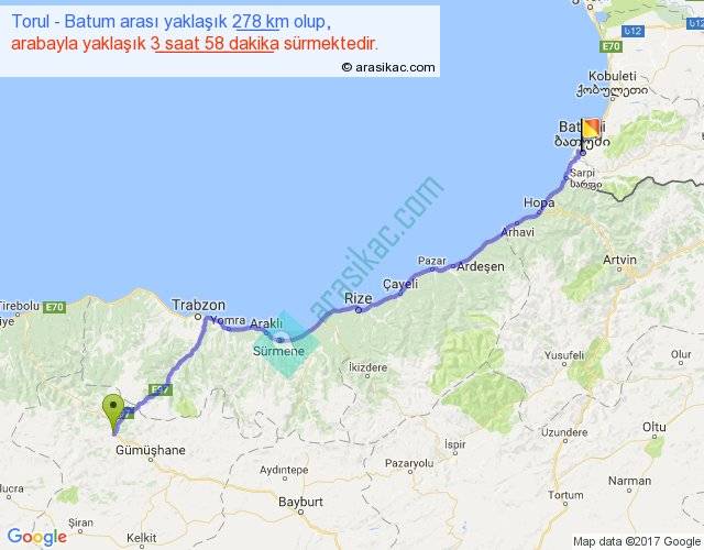 Torul - Batum arası yaklaşık olarak 90 km/h ile yukarıda belirtilen sürede olup, iki yerin kuş uçuşu uzaklığı (mesafesi) 228'dir. Yolculuk otobüsle 5 saat 9 dakika sürmektedir.