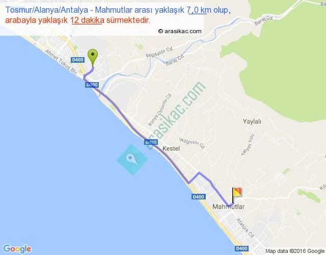 Tosmur Alanya Antalya - Mahmutlar arası yaklaşık olarak 90 km/h ile yukarıda belirtilen sürede olup, iki yerin kuş uçuşu uzaklığı (mesafesi) 6'dir. Yolculuk otobüsle 15 dakika sürmektedir.