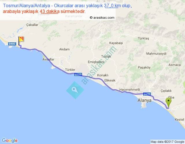 Tosmur Alanya Antalya - Okurcalar arası yaklaşık olarak 90 km/h ile yukarıda belirtilen sürede olup, iki yerin kuş uçuşu uzaklığı (mesafesi) 34'dir. Yolculuk otobüsle 55 dakika sürmektedir.