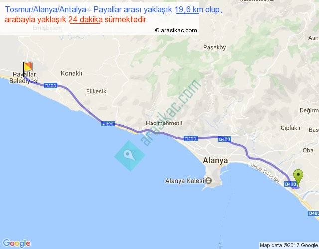 Tosmur Alanya Antalya - Payallar arası yaklaşık olarak 90 km/h ile yukarıda belirtilen sürede olup, iki yerin kuş uçuşu uzaklığı (mesafesi) 18'dir. Yolculuk otobüsle 31 dakika sürmektedir.