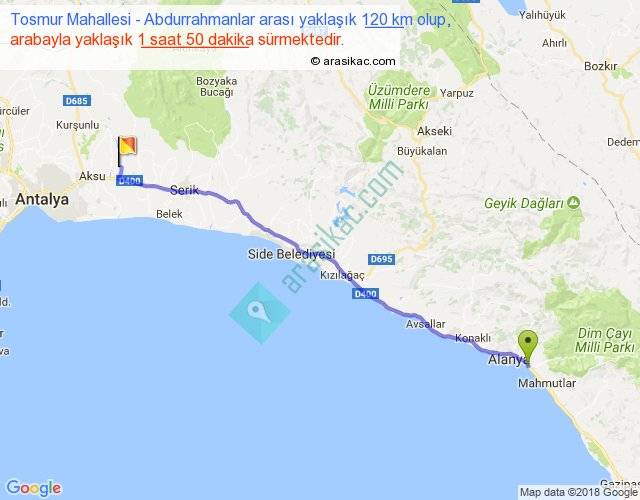 Tosmur Mahallesi - Abdurrahmanlar arası yaklaşık olarak 90 km/h ile yukarıda belirtilen sürede olup, iki yerin kuş uçuşu uzaklığı (mesafesi) 110'dir. Yolculuk otobüsle 2 saat 23 dakika sürmektedir.