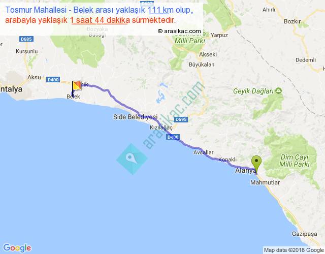 Tosmur Mahallesi - Belek arası yaklaşık olarak 90 km/h ile yukarıda belirtilen sürede olup, iki yerin kuş uçuşu uzaklığı (mesafesi) 95'dir. Yolculuk otobüsle 2 saat 15 dakika sürmektedir.