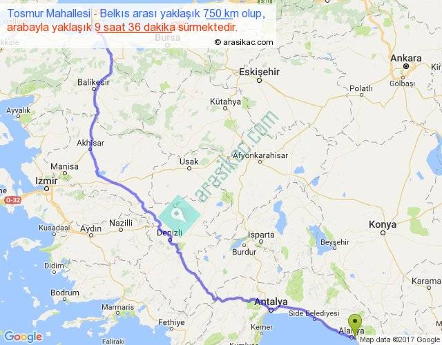 Tosmur Mahallesi - Belkıs arası yaklaşık olarak 90 km/h ile yukarıda belirtilen sürede olup, iki yerin kuş uçuşu uzaklığı (mesafesi) 559'dir. Eğer belirtilen yerler arasında uçak seferi var ise bu süre uçakla 51 dakika'ya kadar düşebilir. Yolculuk otobüsle 12 saat 28 dakika sürmektedir.