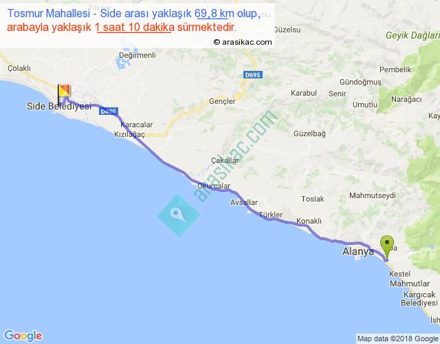 Tosmur Mahallesi - Side arası yaklaşık olarak 90 km/h ile yukarıda belirtilen sürede olup, iki yerin kuş uçuşu uzaklığı (mesafesi) 64'dir. Yolculuk otobüsle 1 saat 31 dakika sürmektedir.