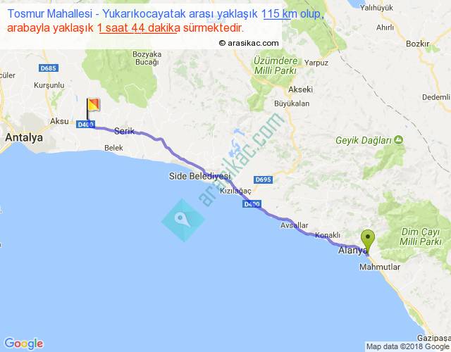 Tosmur Mahallesi - Yukarıkocayatak arası yaklaşık olarak 90 km/h ile yukarıda belirtilen sürede olup, iki yerin kuş uçuşu uzaklığı (mesafesi) 107'dir. Yolculuk otobüsle 2 saat 15 dakika sürmektedir.