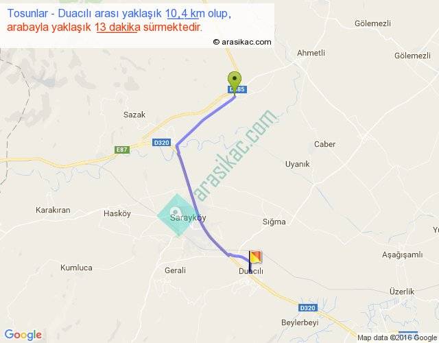 Tosunlar - Duacılı arası yaklaşık olarak 90 km/h ile yukarıda belirtilen sürede olup, iki yerin kuş uçuşu uzaklığı (mesafesi) 8'dir. Yolculuk otobüsle 16 dakika sürmektedir.