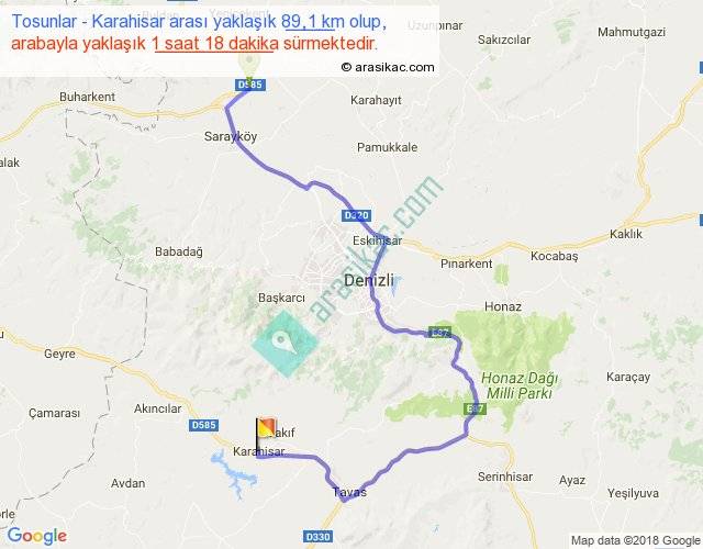 Tosunlar - Karahisar arası yaklaşık olarak 90 km/h ile yukarıda belirtilen sürede olup, iki yerin kuş uçuşu uzaklığı (mesafesi) 40'dir. Yolculuk otobüsle 1 saat 41 dakika sürmektedir.