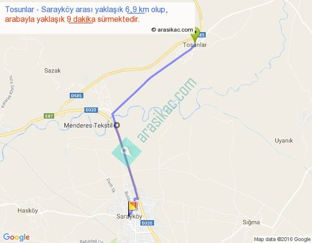 Tosunlar - Sarayköy arası yaklaşık olarak 90 km/h ile yukarıda belirtilen sürede olup, iki yerin kuş uçuşu uzaklığı (mesafesi) 6'dir. Yolculuk otobüsle 11 dakika sürmektedir.