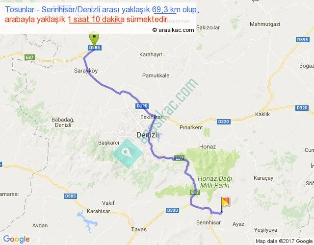 Tosunlar - Serinhisar Denizli arası yaklaşık olarak 90 km/h ile yukarıda belirtilen sürede olup, iki yerin kuş uçuşu uzaklığı (mesafesi) 51'dir. Yolculuk otobüsle 1 saat 31 dakika sürmektedir.