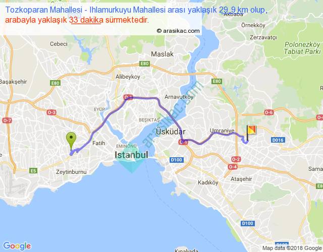 Tozkoparan Mahallesi - Ihlamurkuyu Mahallesi arası yaklaşık olarak 90 km/h ile yukarıda belirtilen sürede olup, iki yerin kuş uçuşu uzaklığı (mesafesi) 20'dir. Yolculuk otobüsle 42 dakika sürmektedir.