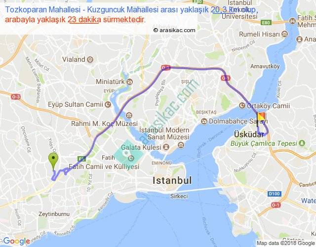 Tozkoparan Mahallesi - Kuzguncuk Mahallesi arası yaklaşık olarak 90 km/h ile yukarıda belirtilen sürede olup, iki yerin kuş uçuşu uzaklığı (mesafesi) 12'dir. Yolculuk otobüsle 29 dakika sürmektedir.