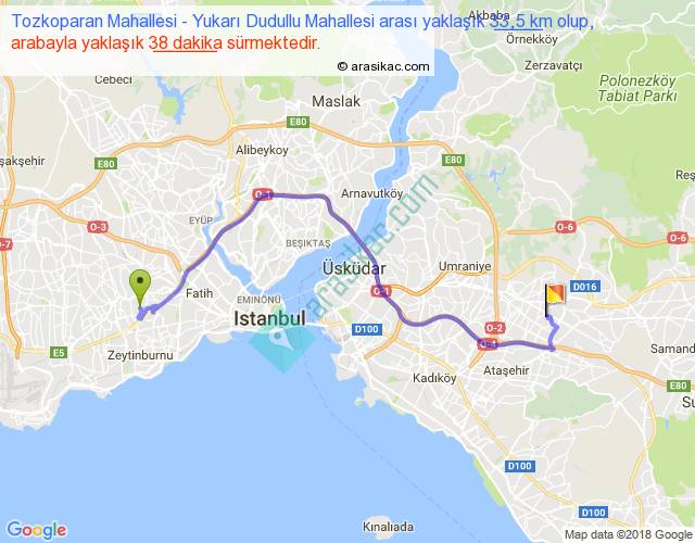 Tozkoparan Mahallesi - Yukarı Dudullu Mahallesi arası yaklaşık olarak 90 km/h ile yukarıda belirtilen sürede olup, iki yerin kuş uçuşu uzaklığı (mesafesi) 22'dir. Yolculuk otobüsle 49 dakika sürmektedir.