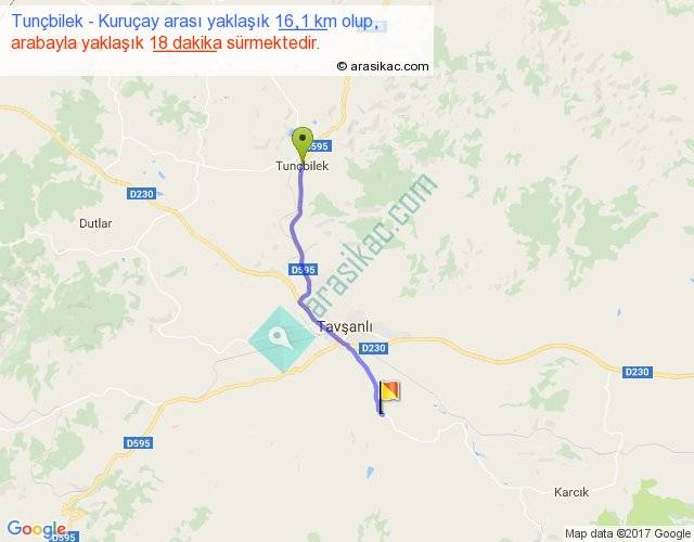 Tunçbilek - Kuruçay arası yaklaşık olarak 90 km/h ile yukarıda belirtilen sürede olup, iki yerin kuş uçuşu uzaklığı (mesafesi) 14'dir. Yolculuk otobüsle 23 dakika sürmektedir.