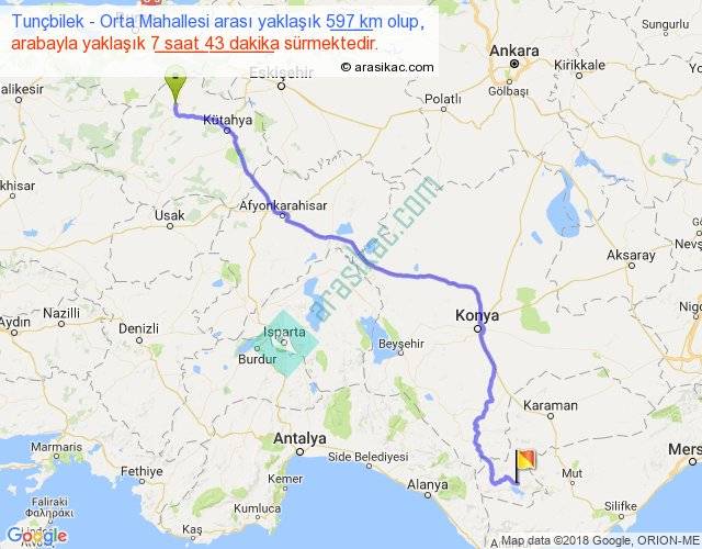 Tunçbilek - Orta Mahallesi arası yaklaşık olarak 90 km/h ile yukarıda belirtilen sürede olup, iki yerin kuş uçuşu uzaklığı (mesafesi) 444'dir. Eğer belirtilen yerler arasında uçak seferi var ise bu süre uçakla 40 dakika'ya kadar düşebilir. Yolculuk otobüsle 10 saat 1 dakika sürmektedir.