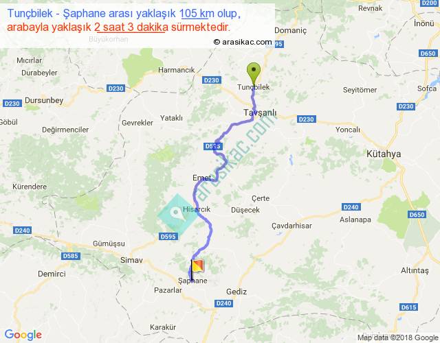 Tunçbilek - Şaphane arası yaklaşık olarak 90 km/h ile yukarıda belirtilen sürede olup, iki yerin kuş uçuşu uzaklığı (mesafesi) 70'dir. Yolculuk otobüsle 2 saat 39 dakika sürmektedir.