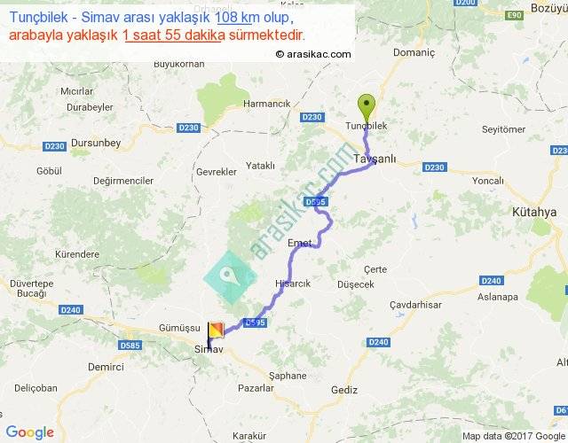 Tunçbilek - Simav arası yaklaşık olarak 90 km/h ile yukarıda belirtilen sürede olup, iki yerin kuş uçuşu uzaklığı (mesafesi) 72'dir. Yolculuk otobüsle 2 saat 29 dakika sürmektedir.