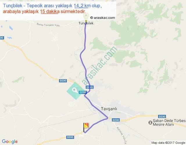 Tunçbilek - Tepecik arası yaklaşık olarak 90 km/h ile yukarıda belirtilen sürede olup, iki yerin kuş uçuşu uzaklığı (mesafesi) 11'dir. Yolculuk otobüsle 19 dakika sürmektedir.