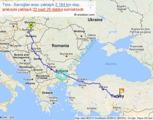 Tura - Sarıoğlan arası yaklaşık olarak 90 km/h ile yukarıda belirtilen sürede olup, iki yerin kuş uçuşu uzaklığı (mesafesi) 1613'dir. Eğer belirtilen yerler arasında uçak seferi var ise bu süre uçakla 2 saat 28 dakika'ya kadar düşebilir. Yolculuk otobüsle 1 gün 5 saat sürmektedir.