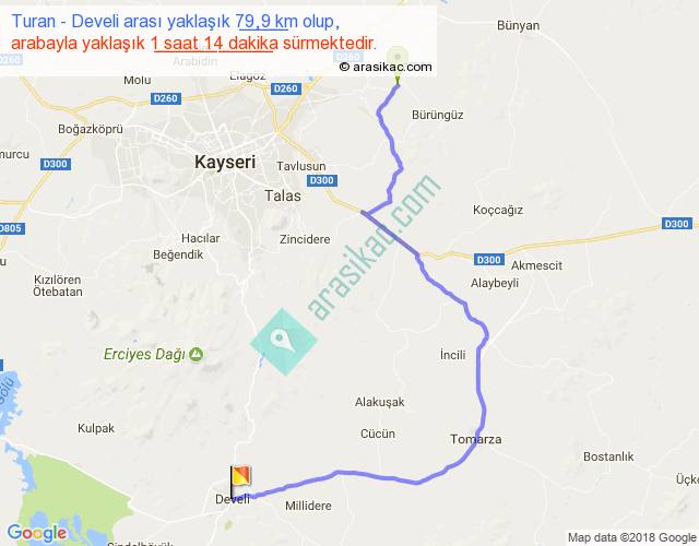 Turan - Develi arası yaklaşık olarak 90 km/h ile yukarıda belirtilen sürede olup, iki yerin kuş uçuşu uzaklığı (mesafesi) 48'dir. Yolculuk otobüsle 1 saat 36 dakika sürmektedir.